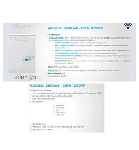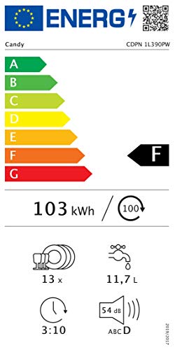 Candy CDPN 1L390PW vaatwasser 60 cm breed met een maximale capaciteit van 13 services. Met draadloze en bluetooth-connectiviteit om de vaatwasser via de Simply-Fi-Mobile app te bedienen, waar je toegang tot vele praktische en functies zoals afstandsbediening, extra programma’s, apparaatstatus, energiebeheer, automatisering, tips en spraakbesturing via intelligente luidsprekers (Google Home of Alexa van Amazon). Hij beschikt over 5 wascycli, waaronder het “Zoom 39 minuten” programma, dat wassen en drogen in slechts 39 minuten mogelijk maakt. Het ontwerp is elegant en beschikt over een led-display voor de bediening en configuratie van de vaatwasser, een stop in de onderste mand en een zelfreinigend drievoudig filter. Hij beschikt over een startvertraging van 3-6-9 uur en heeft een verbruik van 11 l/waterverbruik. Energiebesparend met energie-efficiëntieklasse A+. De afmetingen van de vaatwasser bedragen 85 x 60 x 60 cm.