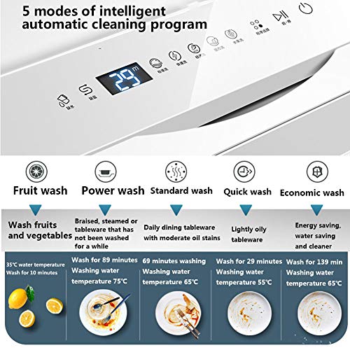 Specificaties: Tafelvaatwasser Huishoudelijke automatische vaatwasser Vrijstaand met 6 couverts 5 programma’s LED-display 5L tank Installatievrij Energiebesparing